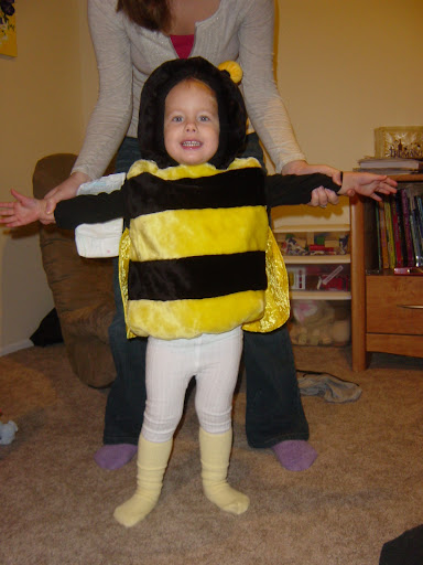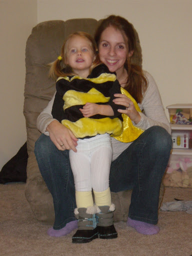 Above is how Abby looked in the play. I was charged with transitioning Abby from her church outfit to her bumblebee outfit. She had on a sweater over her long sleeve black shirt and jeans on over her tights. She, of course, wouldn't go anywhere without her boots. Little did I know that Miriam had intended for me to merely replace the sweater with the bumblebee costume and remove her boots. I removed her pants and put her boots back on ... I thought it looked cute. Kind of fashionably 80's ... which is back in style.